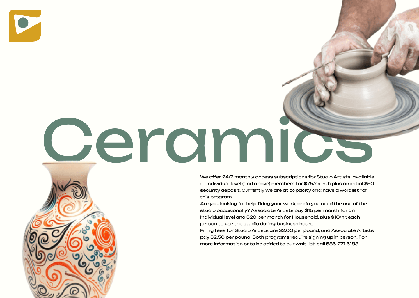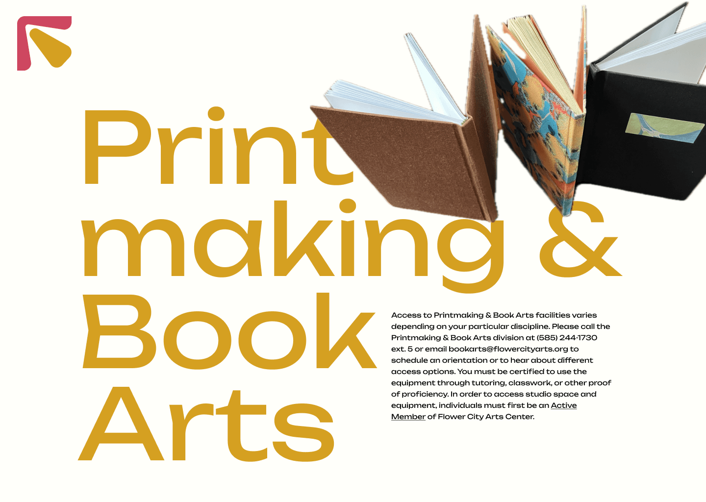 Flower City Arts Center offers foundational arts in Printmaking & Book Arts (PABA) using vintage presses, type, and traditional printing methods; bookbinding, papermaking, and marbling; Fine Arts like painting, drawing, mixed media art, and encaustics; Ceramics, using hand building, wheels, and kilns, and Photography offering a darkroom, professional lighting studio, cyanotype "silver den," and more. This blends with modern tools, such as Digital Media through computer design, photography, videography, editing, digital and audio production, animation, music production, and risograph printing.