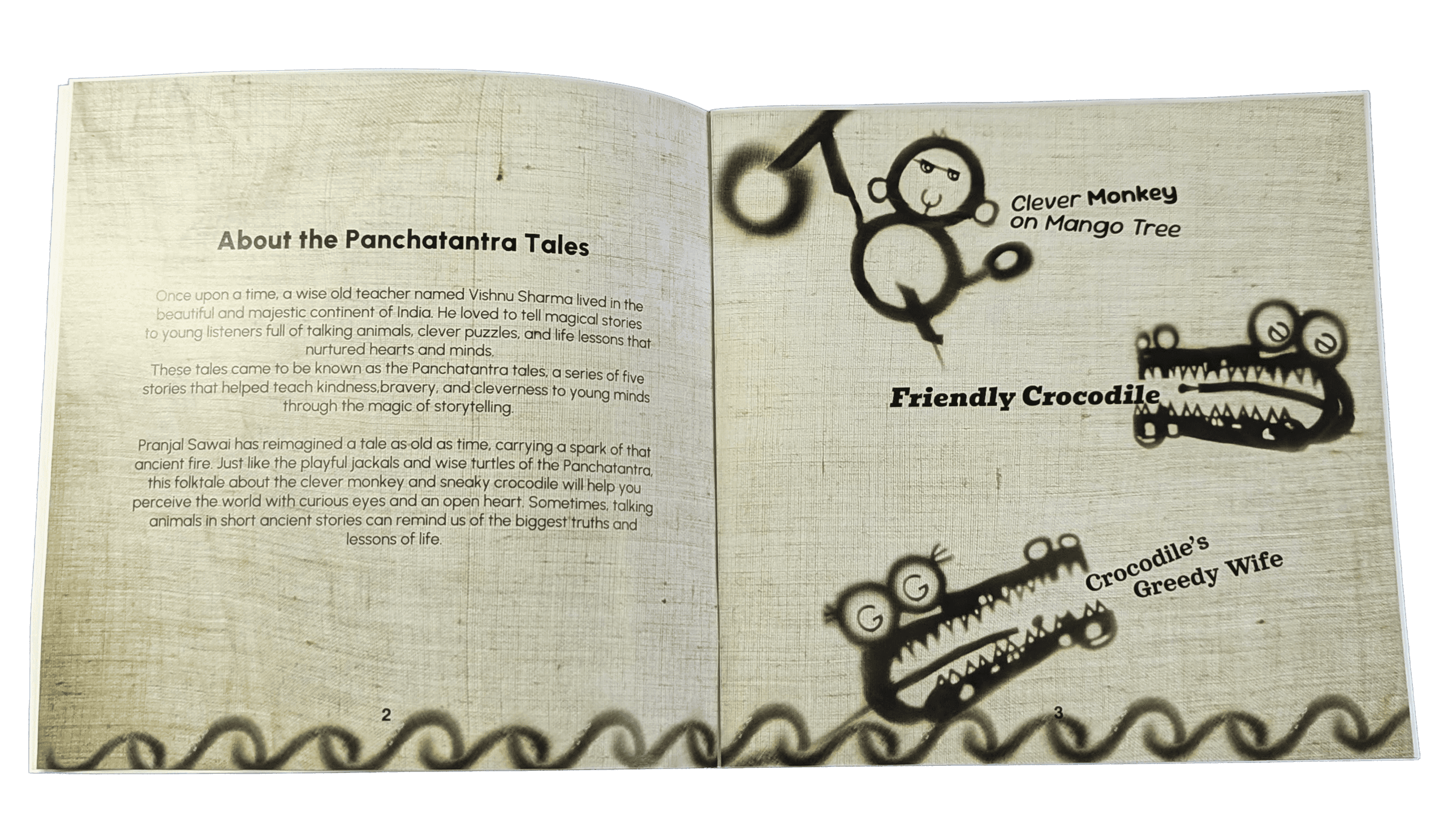 Welcome to my special project! I've taken the amazing stories from the Panchatantra and added a fun twist. Instead of drawing pictures, I've created characters using letters of the alphabet and made them into puppets. Using the art of shadow puppetry as my muse, I've crafted a typographic storybook that is truly one-of-a-kind. Each character, from the clever monkey to the kind crocodile, is represented by carefully cut alphabets transformed into puppets.