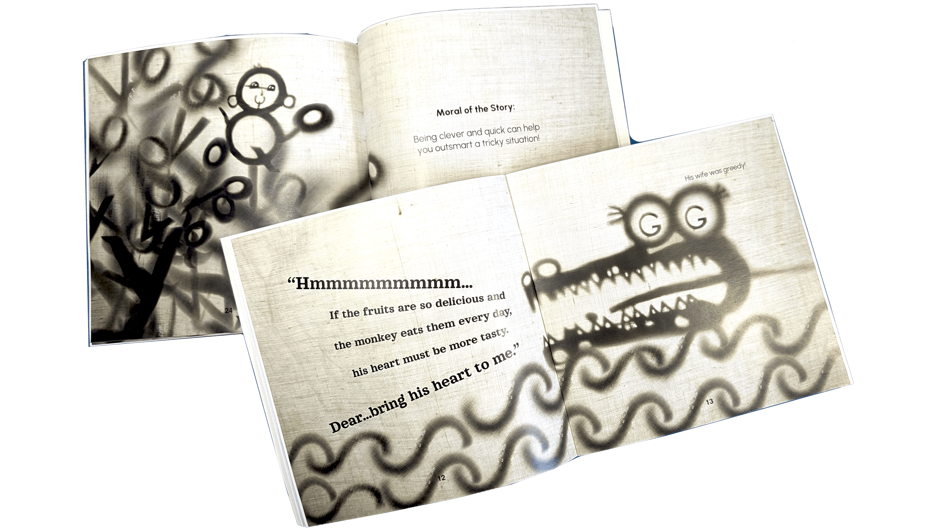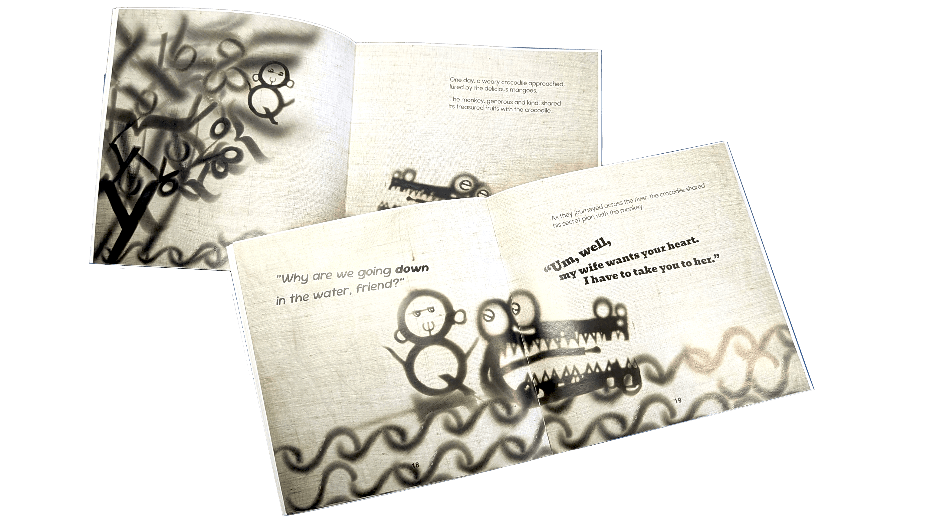 Inspired by shadow puppetry, each character, including the clever monkey and kind crocodile, comes to life through carefully cut alphabets illuminated to cast captivating shadows on plain cotton. The fusion of typography and shadow puppetry creates a visual symphony, breathing contemporary life into ancient tales.